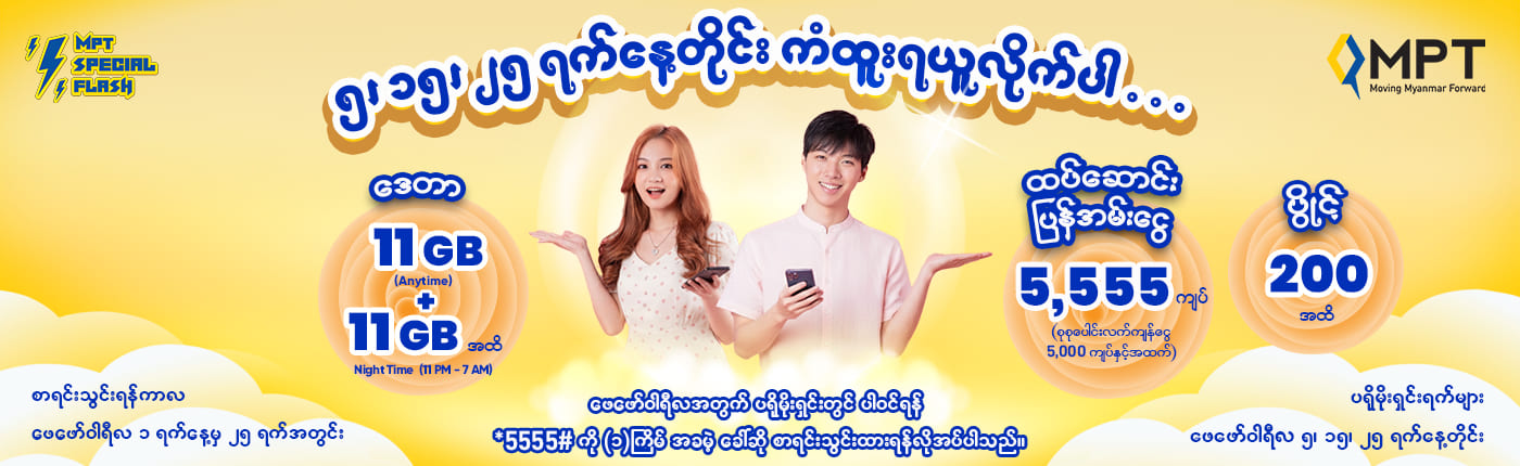 As special promotion in Feb’25, you can win “up to 11GB+11GB (Night 11PM~7AM)” , “up to 200 additional Club Points” by free subscribing via *5555# within 1st to 25th Feb’25 and making top up at least 1,000 Ks via any channel and “5555Ks additional Cashback” for having 5000Ks and above phone bill balance on Special Flash Promotion days of 5th , 15th , 25th Feb’25.