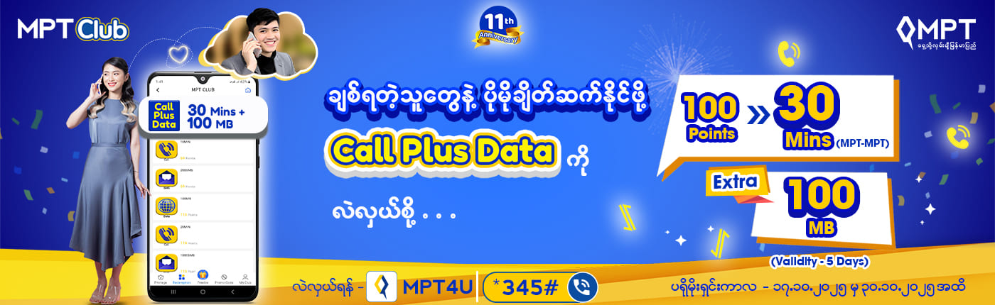 Call Plus Data ပရိုမိုးရှင်းမှာဆိုရင် MPT Club ၁၀၀ ပွိုင့်သုံးရုံဖြင့် MPT အချင်းချင်း မိနစ်ဝက် (မိနစ် ၃၀) ဖုန်းခေါ်ခွင့်အပြင် 100 MB ကိုပါ တစ်ပါတည်း ထပ်မံရရှိနိုင်ပါတယ်။ လဲလှယ်ထားသော ဖုန်းပြောမိနစ်နဲ့ ဒေတာ ကို (၅) ရက်အတွင်း အသုံးပြုနိုင်ပါတယ်။
