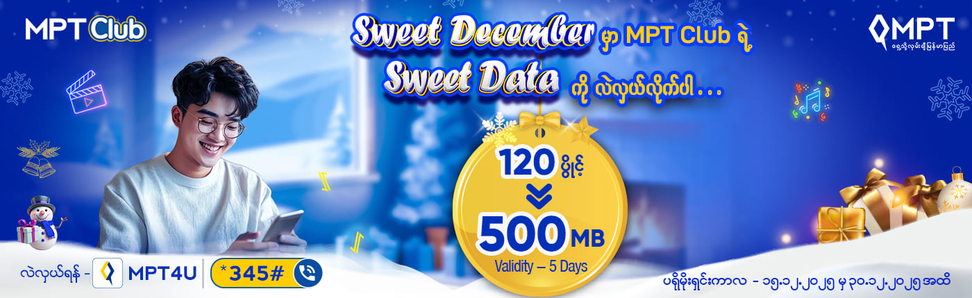 MPT Club ရဲ့ Sweet Data ပရိုမိုးရှင်းမှာ 500 MB ဒေတာ ကို MPT Club ပွိုင့် (၁၂၀) ပွိုင့် တည်းနဲ့ စိတ်ကြိုက်လဲလှယ်ရယူနိုင်ပါတယ်။